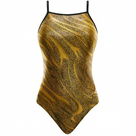 The Women’s Slither Foil Funnies Wing Back Swimsuit utilizes a sleek Poly/Spandex fabrication with a shiny foil finish to provide performance in and out of the water.